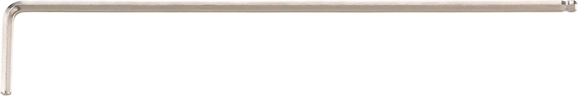 Lange inbussleutel kogelkop klemring, 4 mm. Voor binnenzeskantbouten, zwenkhoek tot 25 graden naar iedere kant, met kogelkop en klemring aan de lange kant, om ook snel en betrouwbaar te kunnen werken op moeilijk toegankelijk plaatsen, bouten worden stevig vastgehouden, Chroom-Vanadium, vernikkeld.
