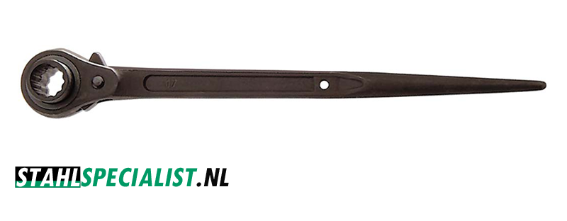 Werfpuntratel, 19x22 mm. Omschakelbare ratel met twee vaste doppen in verschillende maten, centreerpunt aan de achterzijde, gefosfateerd.